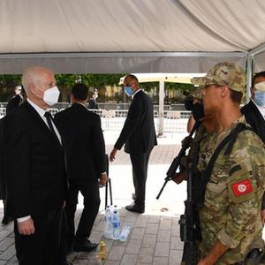 8月1日,突尼斯总统赛义德在首都突尼斯市中心与街头维护治安的士兵交谈。
