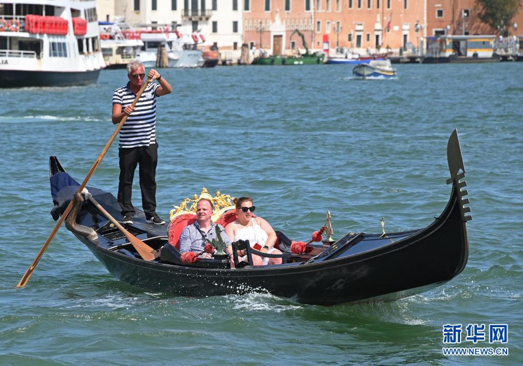 8月3日,游客乘坐“贡多拉”船游览意大利威尼斯。