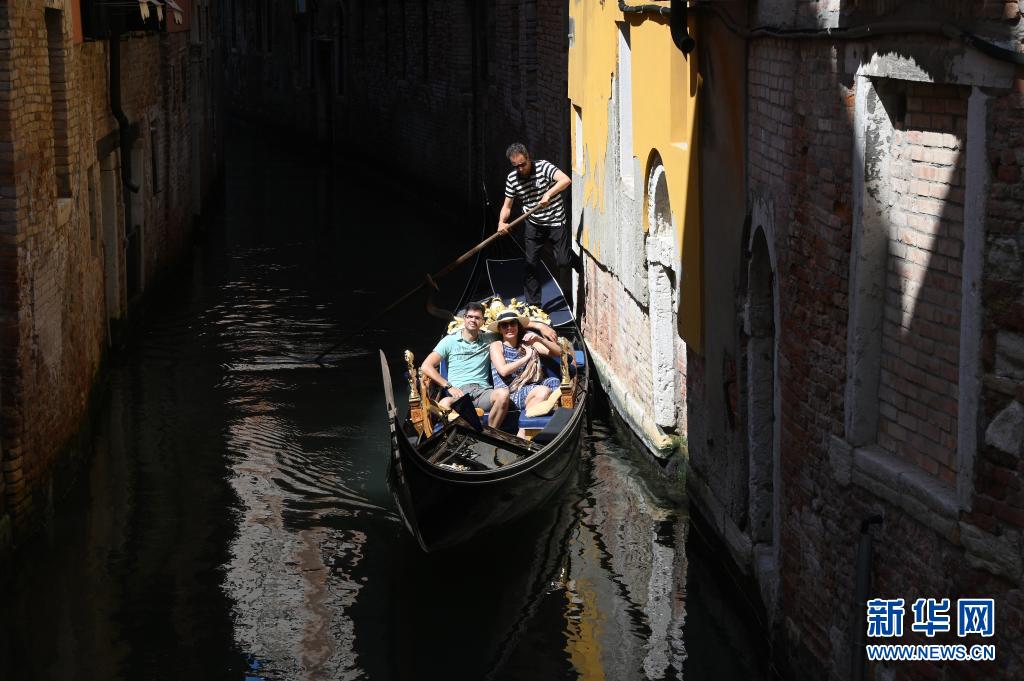 8月3日,游客乘坐“贡多拉”船游览意大利威尼斯。