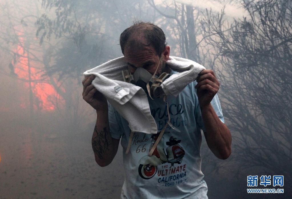 8月3日,一名男子在希腊雅典北部郊区的山火现场掩住口鼻。