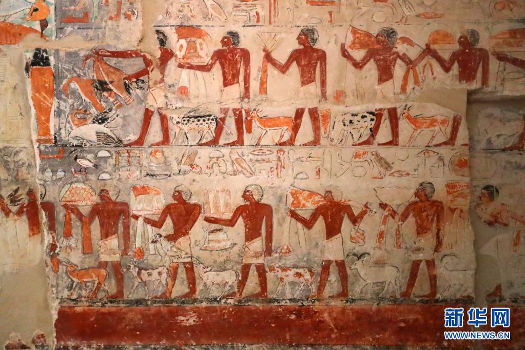 这是8月3日在埃及首都开罗以南的塞加拉地区一个官员墓内拍摄的彩绘浮雕壁画。