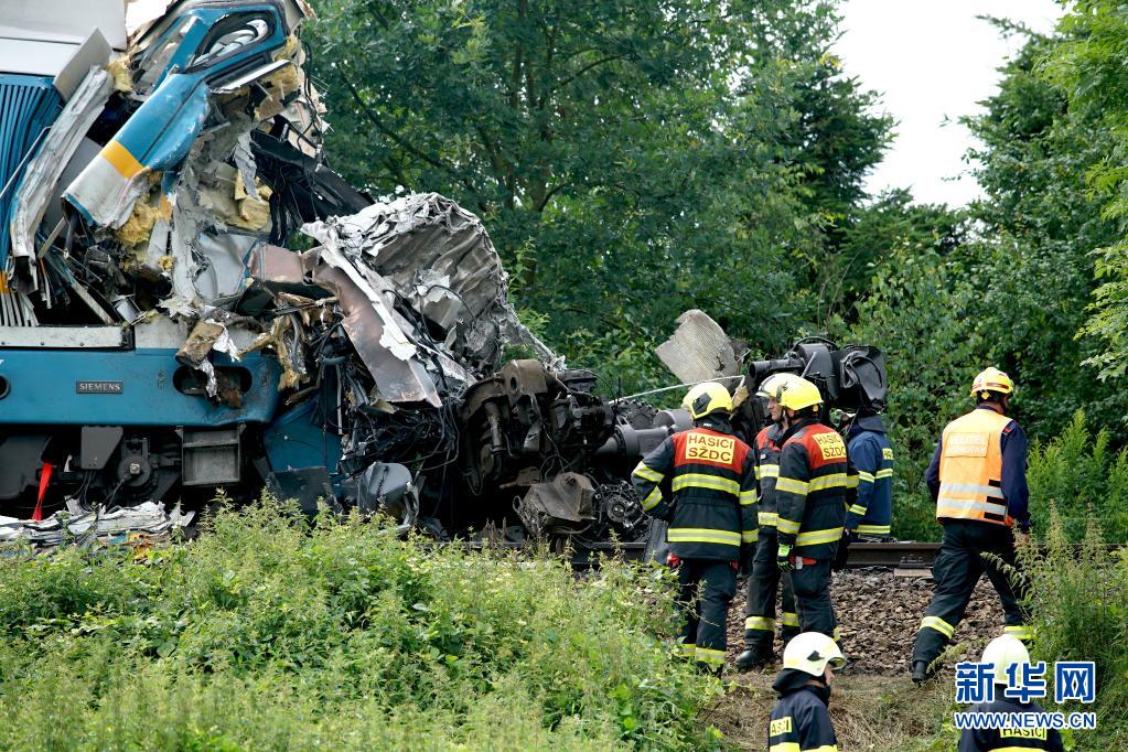 8月4日,救援人员在捷克比尔森州的火车相撞事故现场工作。