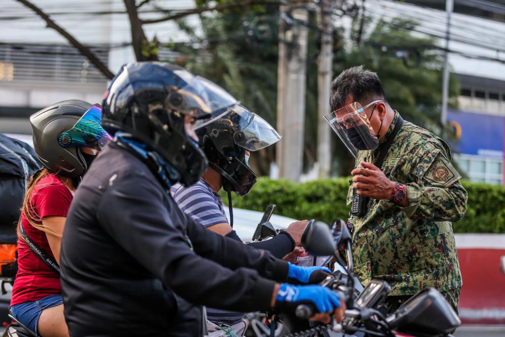8月6日,一名军人在菲律宾奎松市街头检查市民是否遵守防疫规定。新华社发(乌马利摄)
