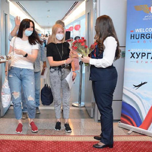 8月9日,机场工作人员在埃及红海城市胡尔加达一机场欢迎抵达的俄罗斯旅客。