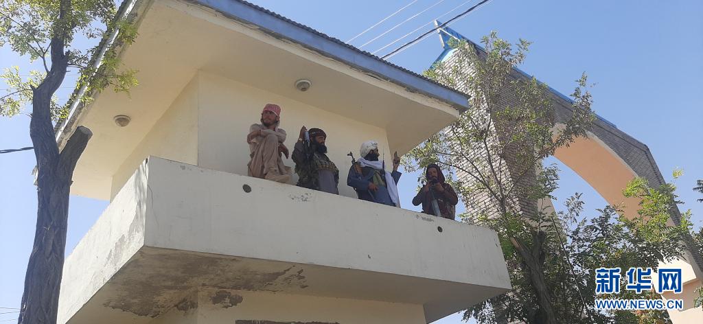 这张8月12日拍摄的照片显示塔利班武装人员站在阿富汗东部加兹尼省首府加兹尼市的一处建筑上。