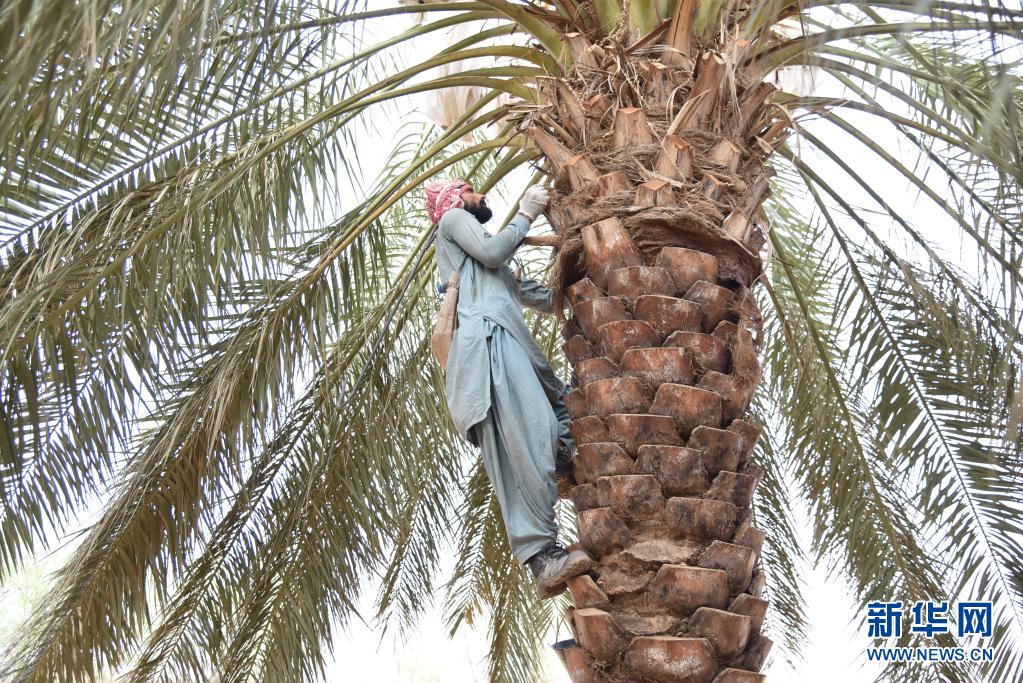8月12日,工人在沙特阿拉伯加特的一家农场内采摘椰枣。