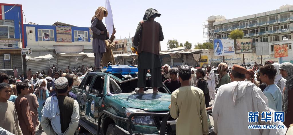 8月13日,塔利班武装人员在阿富汗第二大城市坎大哈街头。
