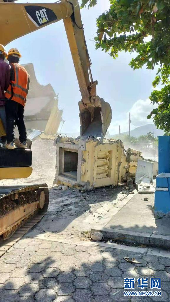 8月15日,救援人员在海地莱昂格莱清理废墟。