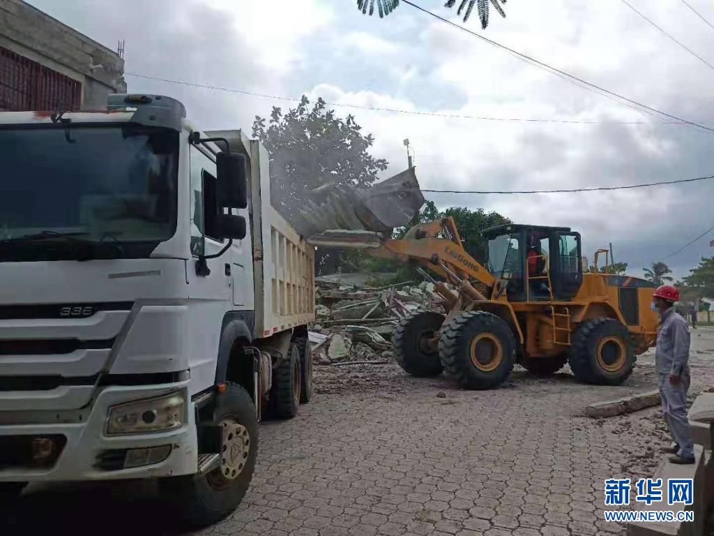 8月15日,救援人员在海地莱昂格莱清理废墟。