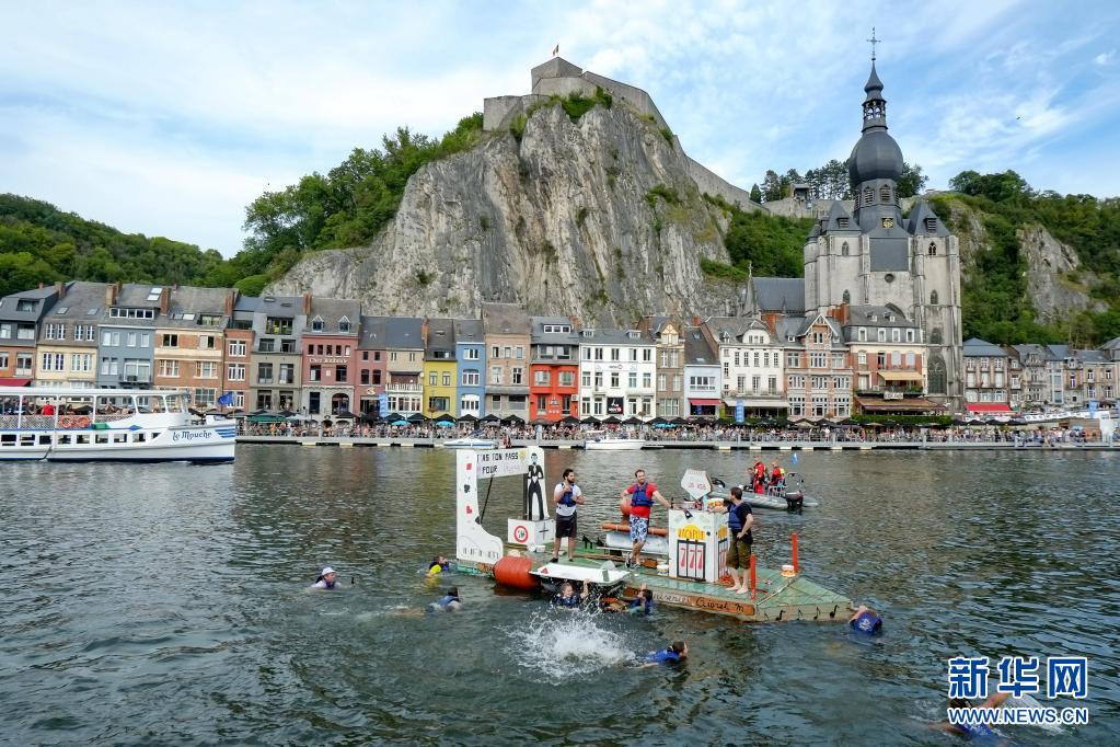 8月15日,在比利时南部小城迪南的默兹河上,人们参加“浴缸划船节”的表演。