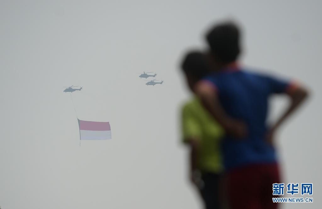 8月17日,人们注视着悬挂印度尼西亚国旗的直升机飞过雅加达上空。8月17日是印度尼西亚独立日。新华社发(祖卡南摄)