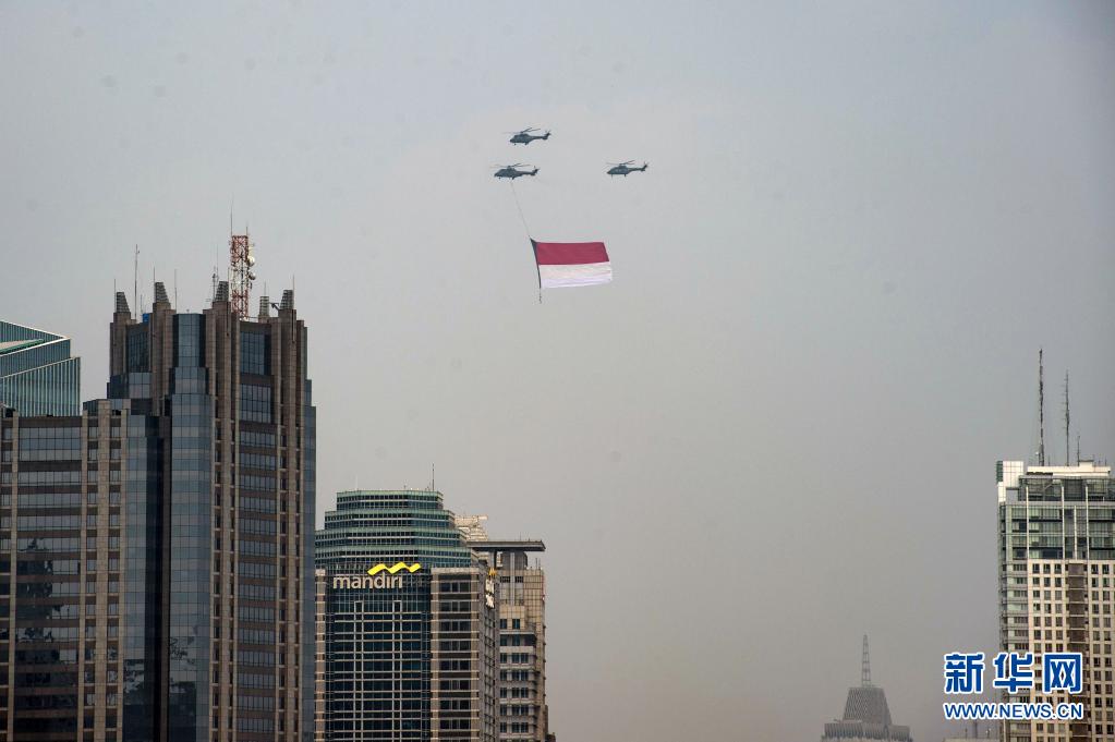 8月17日,悬挂印度尼西亚国旗的直升机飞过雅加达上空。8月17日是印度尼西亚独立日。新华社发(维里摄)