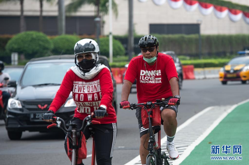 8月17日,人们身穿红白配色服装在雅加达街头骑行,庆祝印度尼西亚独立日。8月17日是印度尼西亚独立日。新华社发(维里摄)