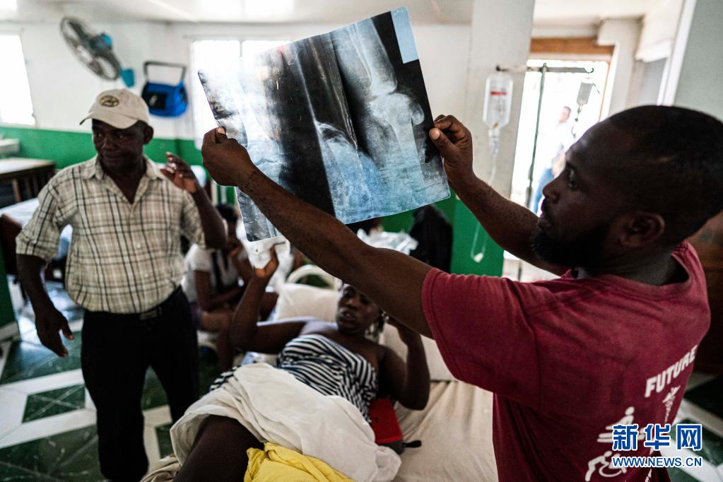 8月18日,一名男子在海地震中附近的莱凯的一家医院展示X光片。