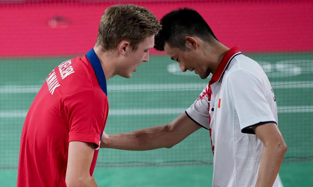 8月2日,丹麦选手安赛龙(左)与中国选手谌龙赛后致意。新华社记者薛玉斌摄