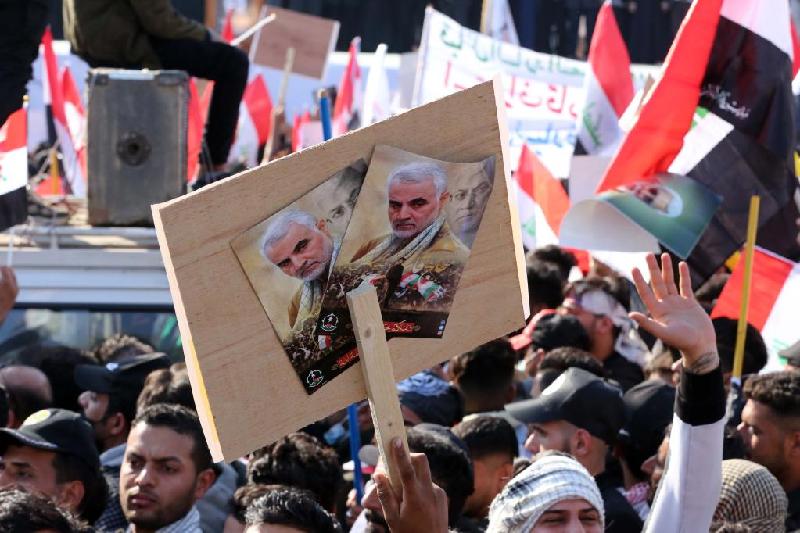1月3日,在伊拉克巴格达,人们手举苏莱曼尼和穆汉迪斯形象的海报和伊拉克国旗参加苏莱曼尼和穆汉迪斯遇袭身亡一周年悼念活动。新华社发