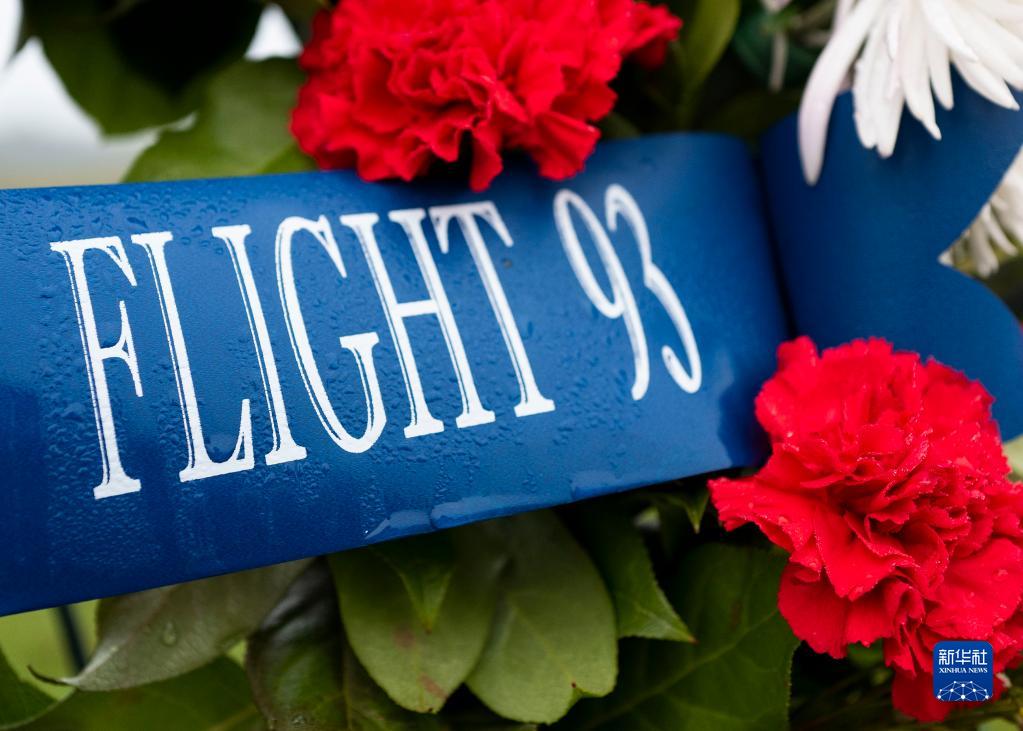 9月9日,在美国宾夕法尼亚州尚克斯维尔的93号航班国家纪念园,一个花环上标记着“93号航班”字样。新华社发(纳特·斯莫尔伍德 摄)
