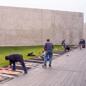纪念馆里,拿起耳机,可以听到数名乘客与地面亲人最后通话的录音。给父亲的、给丈夫的、给孩子的;平静的、颤抖的、泣不成声的……纪念馆外,一群艺术家或跪或坐,比对着照片,用彩色粉笔绘制航班遇难者的大幅头像。