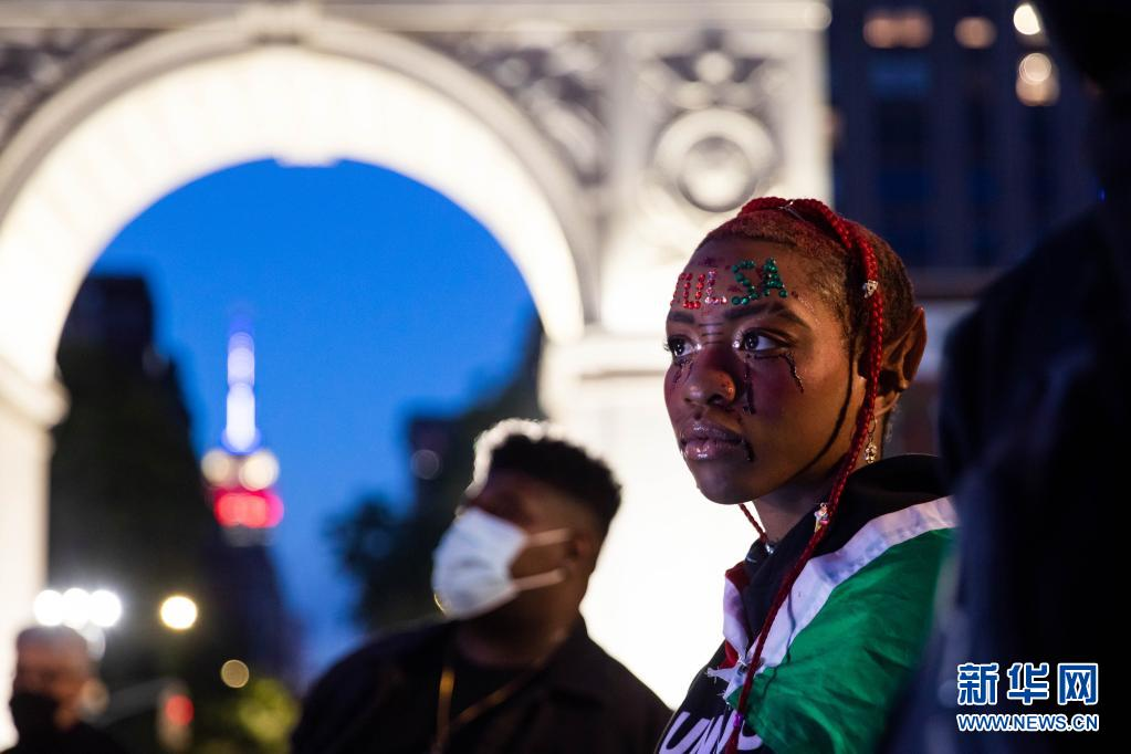 5月31日,在美国纽约,一名参加纪念塔尔萨种族屠杀一百周年活动的女子额头贴有“塔尔萨”字样的装饰。新华社发(郭克摄)