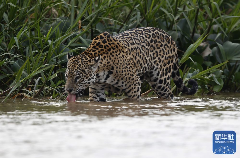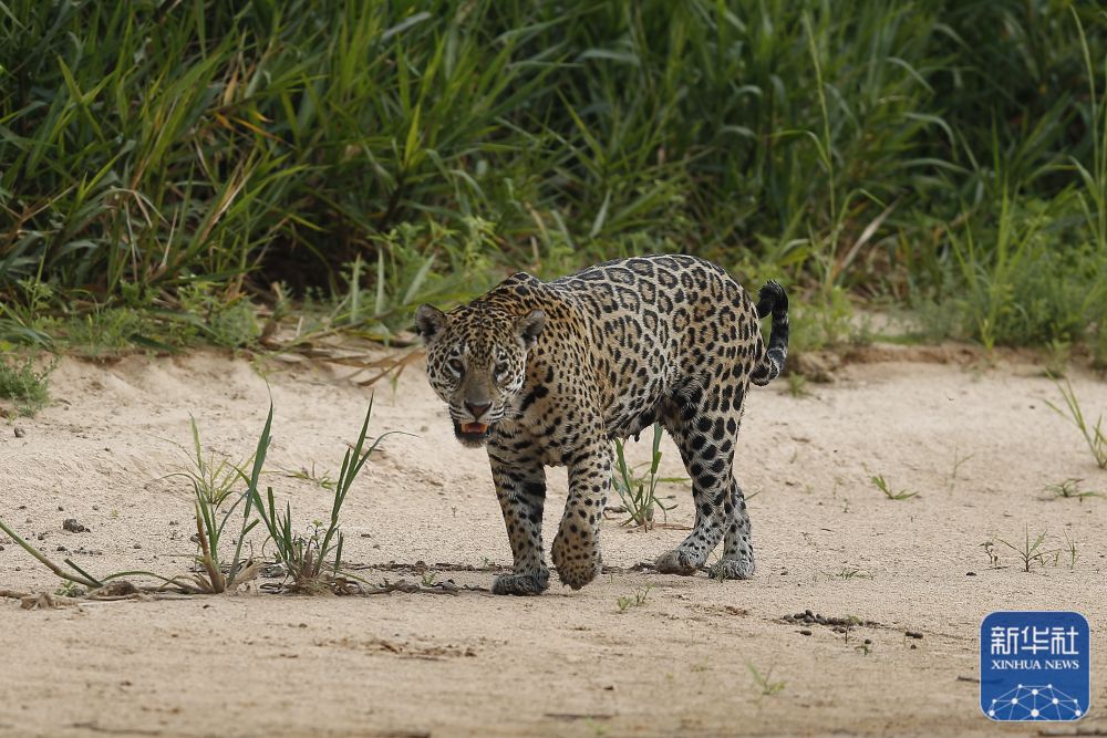 ↑2021年9月26日,在巴西潘塔纳尔湿地,一只美洲豹向库亚巴河走去。新华社发(卢西奥·塔沃拉摄)