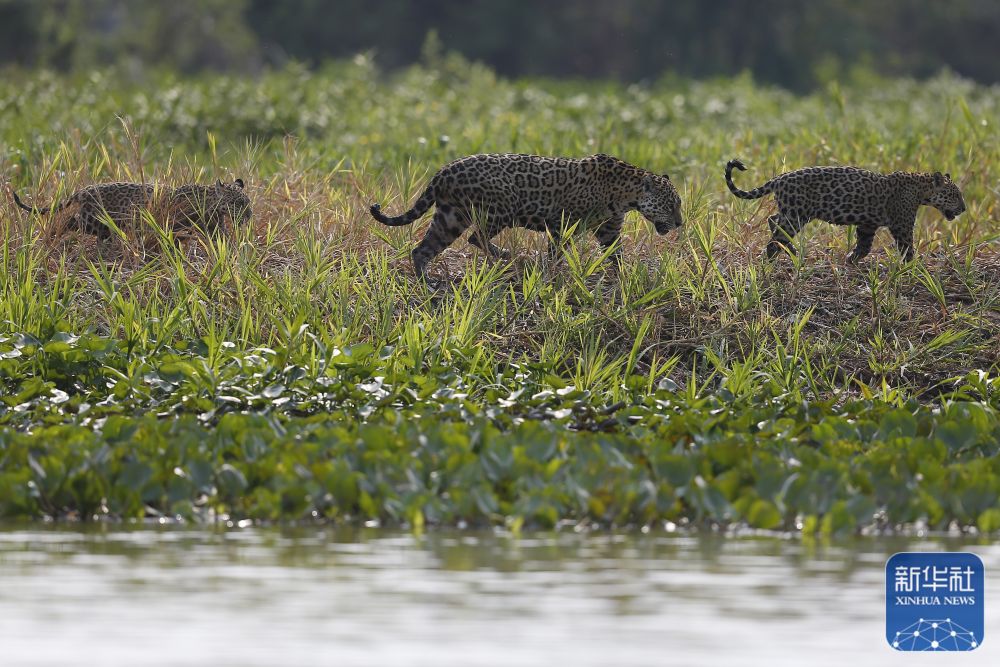 ↑2021年9月25日,在巴西潘塔纳尔湿地,一只美洲豹和“家人”在库亚巴河岸边散步。新华社发(卢西奥·塔沃拉摄)