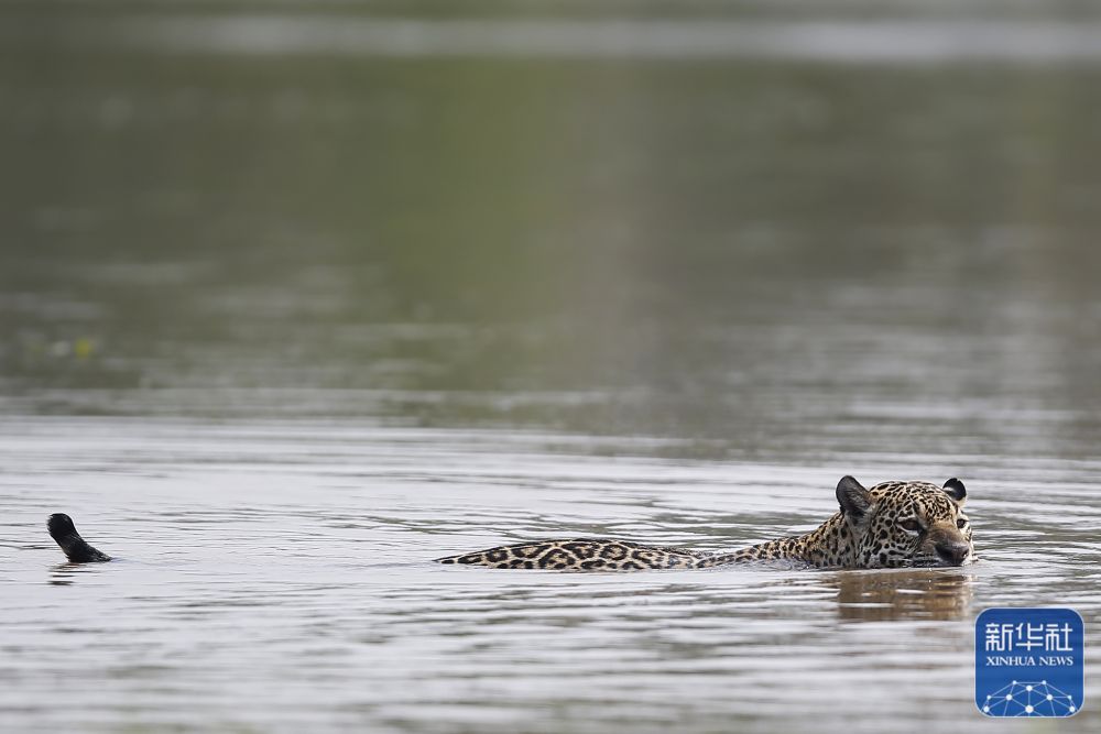↑2021年9月26日,在巴西潘塔纳尔湿地,一只美洲豹泅渡库亚巴河。新华社发(卢西奥·塔沃拉摄)
