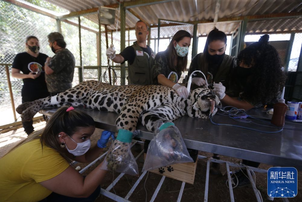 ↑2020年9月27日,在巴西戈亚斯州,动物保护组织救治受伤的美洲豹。新华社发(卢西奥·塔沃拉摄)