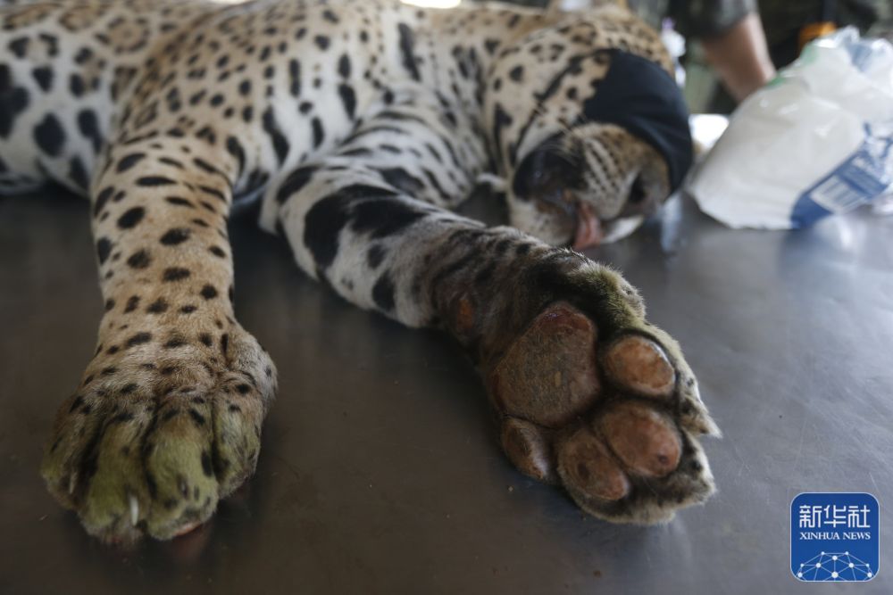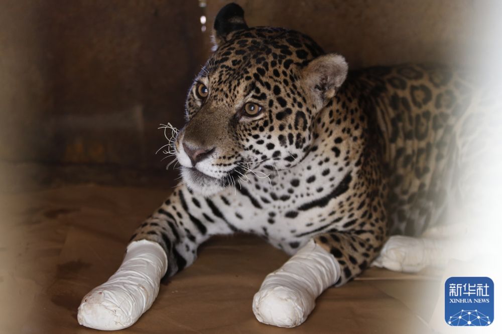 ↑2020年9月27日,在巴西戈亚斯州一个动物保护中心,美洲豹爪子的伤口被包扎好。新华社发(卢西奥·塔沃拉摄)