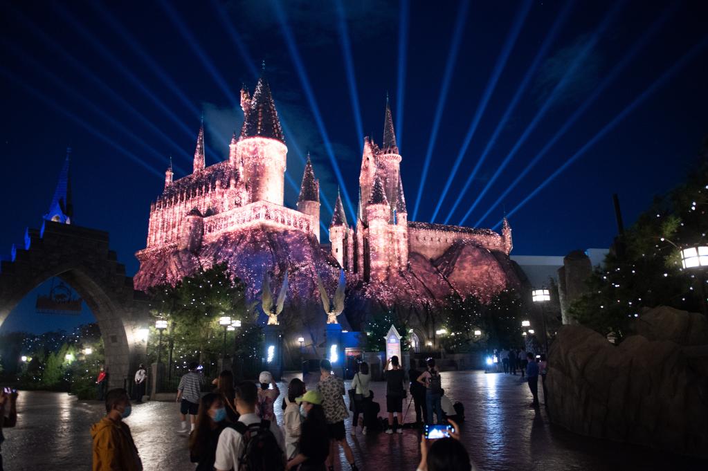 8月25日,游客在观看北京环球影城哈利·波特的魔法世界主题景区霍格沃茨城堡夜间灯光庆典表演。(新华社记者陈钟昊摄)
