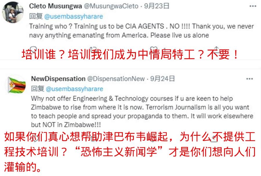 有网友在美驻津使馆推特账号下留言说,美国对当地媒体的所谓培训是“为中央情报局找线人”;还有网友认为,美国如果是出于真心,应该为津巴布韦提供工程技术培训,而不是出资灌输和宣传美国的“恐怖主义新闻学”。