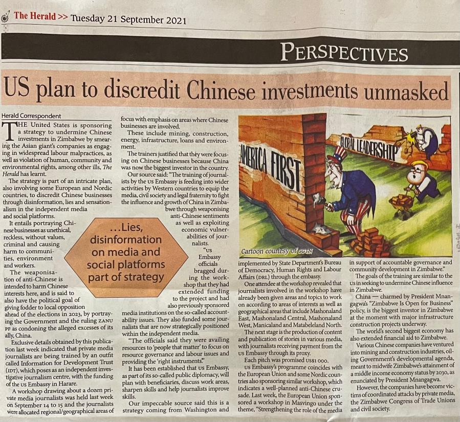 津巴布韦第一大报《先驱报》9月21日报道说,9月14日至15日,一个名为“信息促进发展信托基金”的机构邀请津巴布韦和周边国家的12名私营媒体记者参加研讨会。会议期间,该机构对这些记者进行培训,并要求他们瞄准采矿业、建筑业、能源业、基础设施建设等中资企业涉足较多的领域,重点关注中资企业的“问题”,如违反劳动法、破坏环境、与当地人冲突等议题,并予以报道。该活动得到美国驻津使馆赞助。