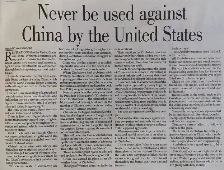 津巴布韦《先驱报》刊登的评论文章《不作美国反华棋子》。新华社记者张玉亮摄
