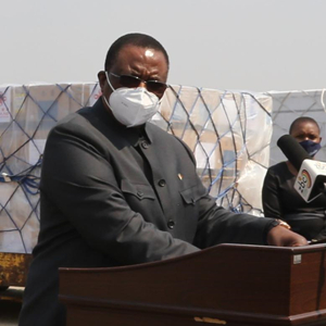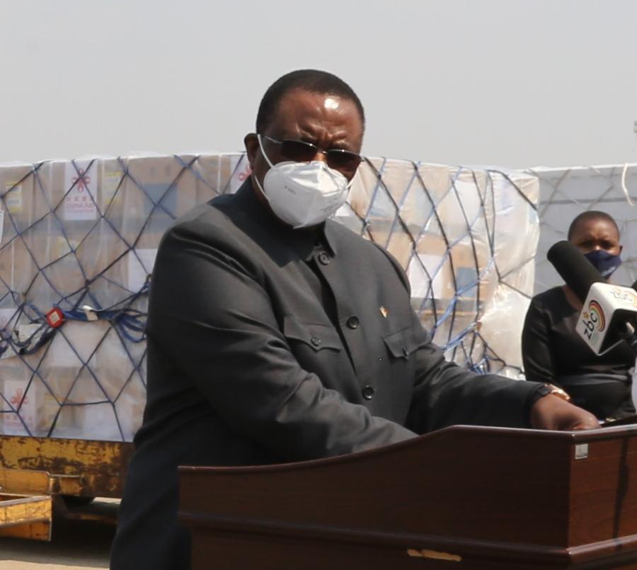 9月26日,津巴布韦副总统兼卫生部长奇温加在中国援助第四批新冠疫苗的接收仪式上致辞。新华社发