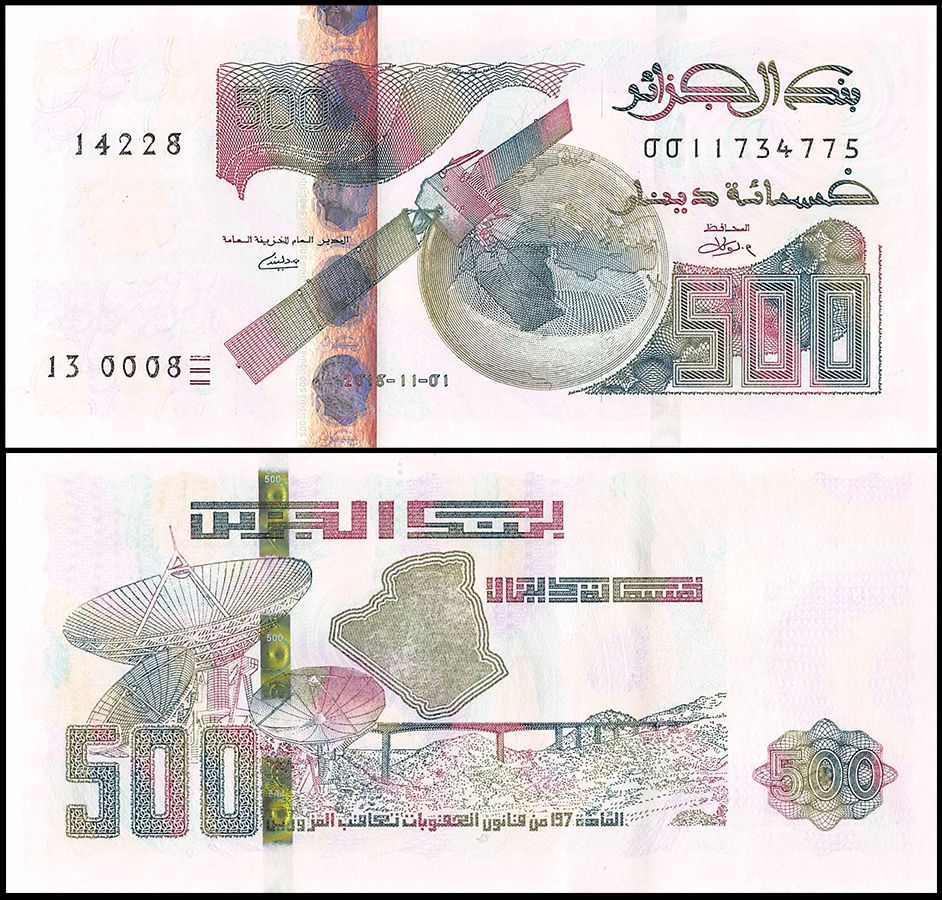 在阿尔及利亚2018年发行的500第纳尔纸币上,有一颗中国研制和发射的卫星。