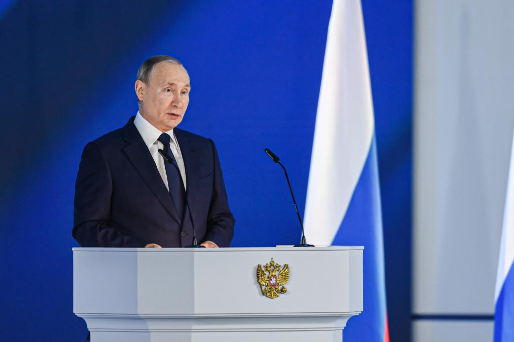 4月21日,俄罗斯总统普京在莫斯科发表国情咨文。(新华社发,叶甫盖尼·西尼岑摄)