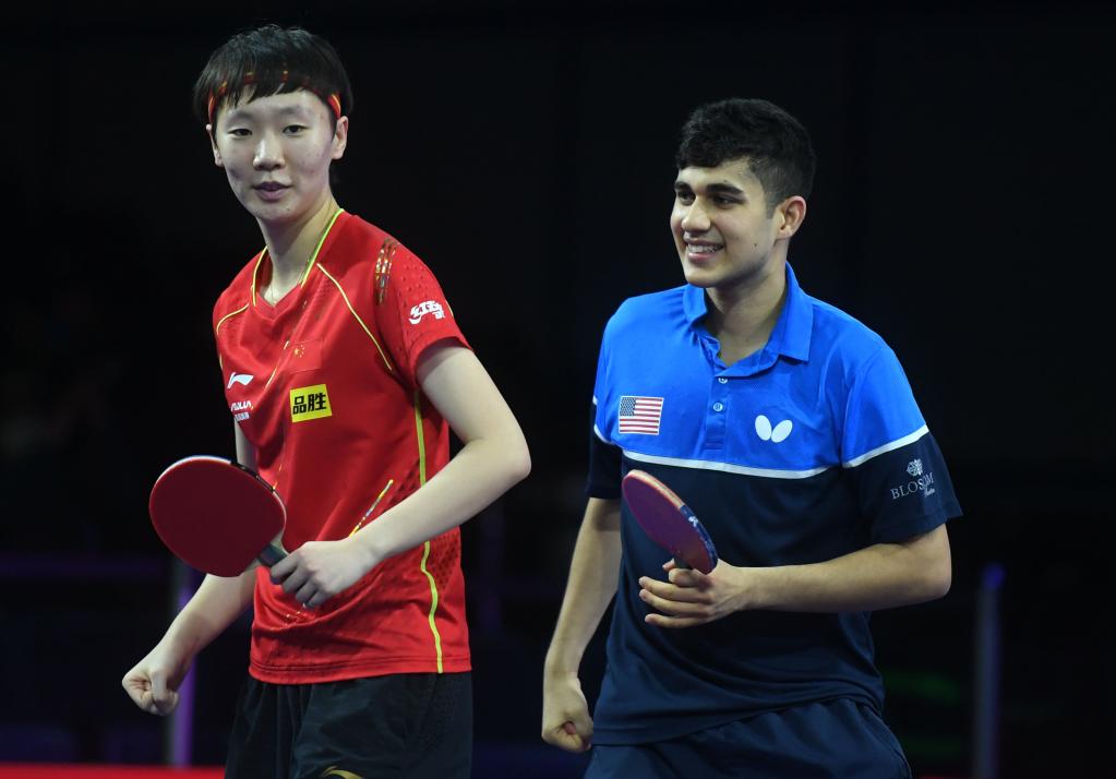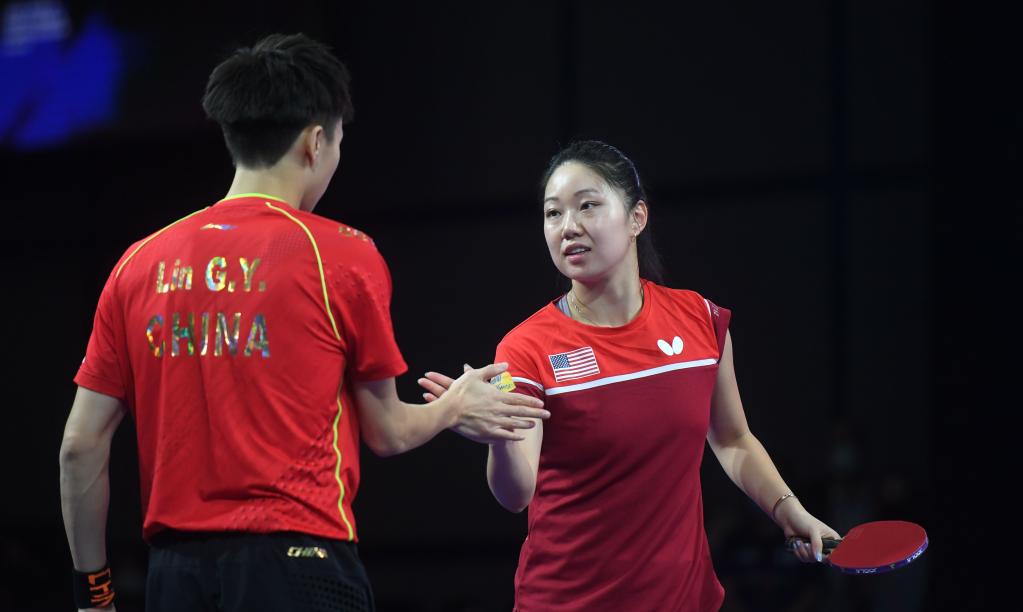 11月23日,在美国休斯敦举行的2021世界乒乓球锦标赛混合双打第一轮比赛中,中美跨国组合林高远(中国)/张安(美国)和卡纳克(美国)/王曼昱(中国)战胜各自对手,携手晋级下一轮。图为卡纳克/王曼昱(左)在比赛中。(新华社记者吴晓凌摄)