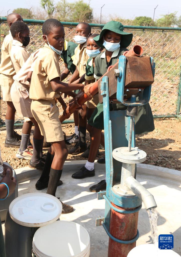 11月3日,在津巴布韦南马塔贝莱兰省省会关达的塞农多小学,学生从中国援建水井里打水。新华社发(陈雅琴摄)