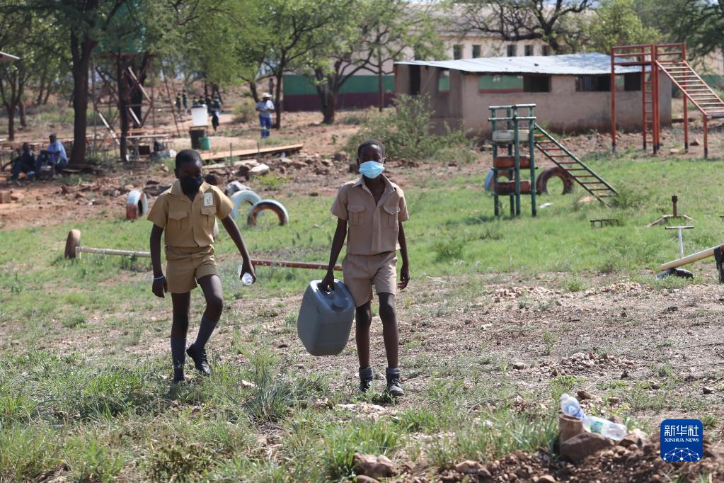 11月3日,在津巴布韦南马塔贝莱兰省省会关达的塞农多小学,学生拿着水桶去中国援建水井接水。新华社发(陈雅琴摄)