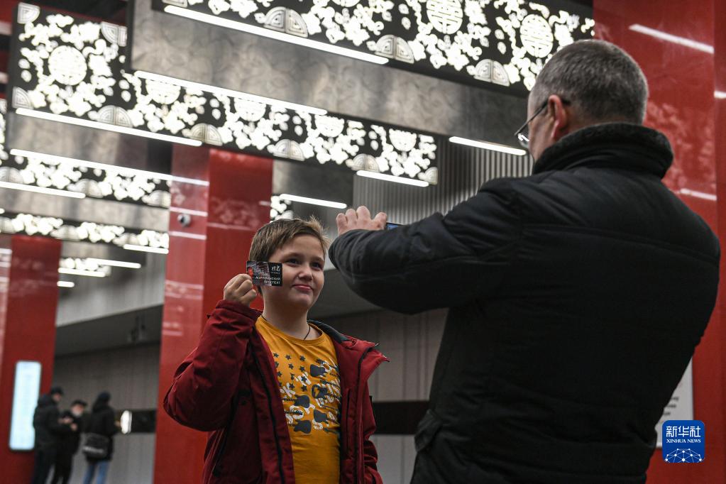 12月7日,在俄罗斯首都莫斯科,一名小朋友手持印有米丘林大街站照片的地铁票留影。