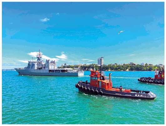 ▲1月18日,新西兰海军惠灵顿号舰(左)从位于奥克兰的德文波特军港启航前往汤加。新西兰国防部18日说,新西兰海军两艘救援舰已于当天出发前往汤加,准备向汤加提供以淡水为主的救援物资。新华社发(新西兰国防部供图)