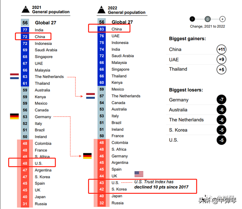 2021年是世界第二,但一年过去了,中国得分整整增加了11个百分点,是唯一一个信任度超过80%的国家。