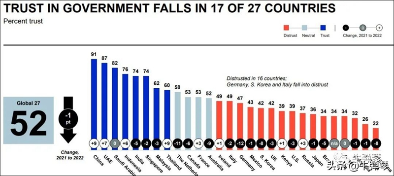 这份2022年全球信任度调查,出自美国知名公关公司爱德曼(Edelman)。自2000年以来,一年一份,业内权威。