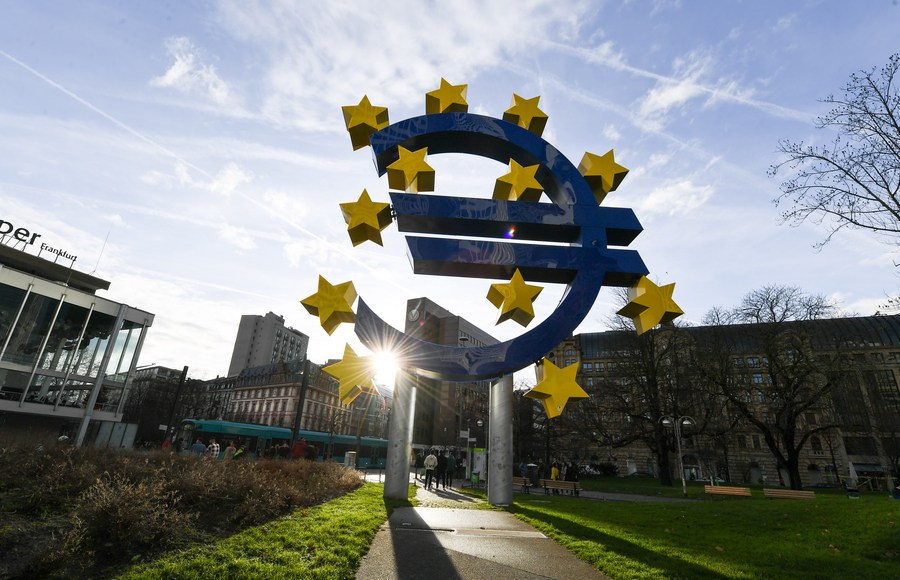 这是2021年12月30日在德国法兰克福拍摄的欧元雕塑。新华社记者逯阳摄