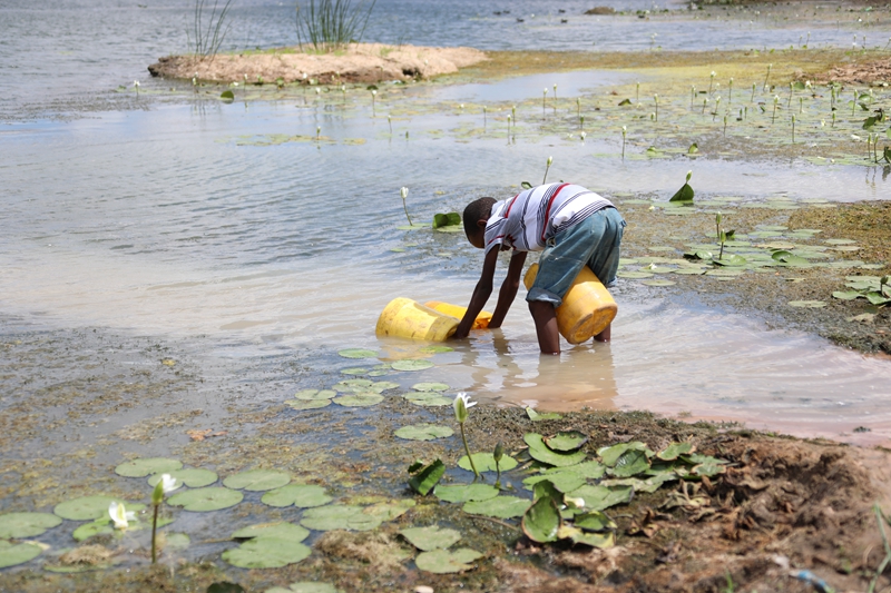 ↑3月23日,一名男孩在肯尼亚基利菲的一个储水设施中取水。