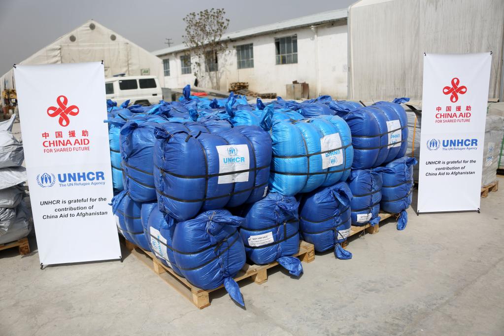 这是3月27日在阿富汗首都喀布尔拍摄的中国南南合作援助基金同联合国难民署合作援助阿富汗的人道主义物资。