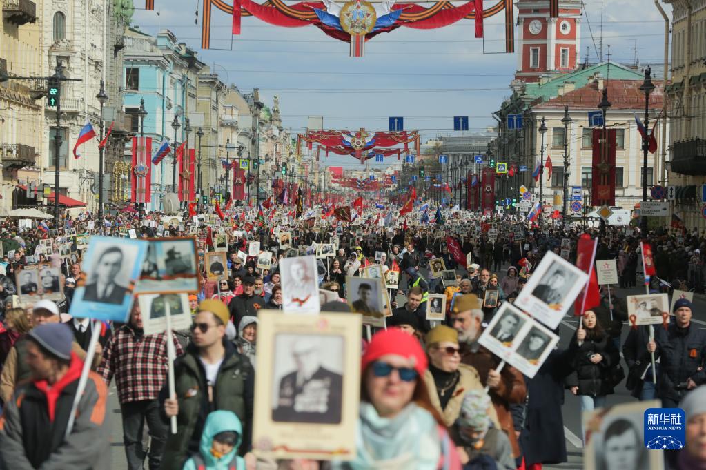 5月9日,俄罗斯圣彼得堡民众手持老战士的照片或画像参加“不朽军团”游行。