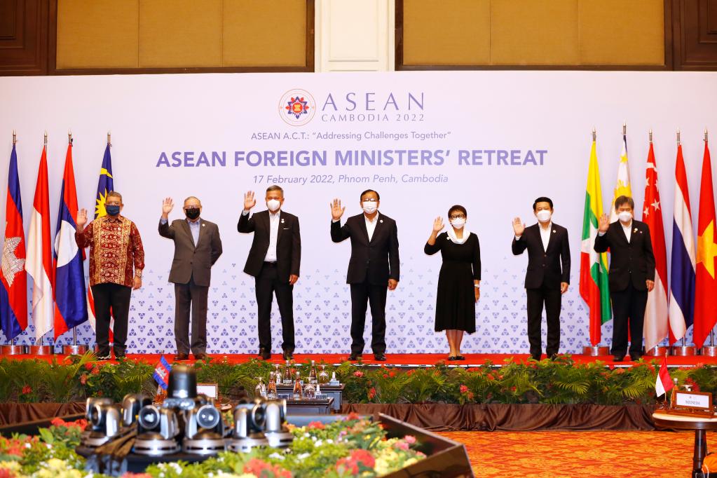 2月17日,在柬埔寨首都金边,与会嘉宾合影留念。东盟国家外长当天在柬埔寨首都金边举行非正式会议。新华社发(索万纳拉摄)