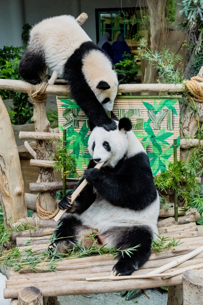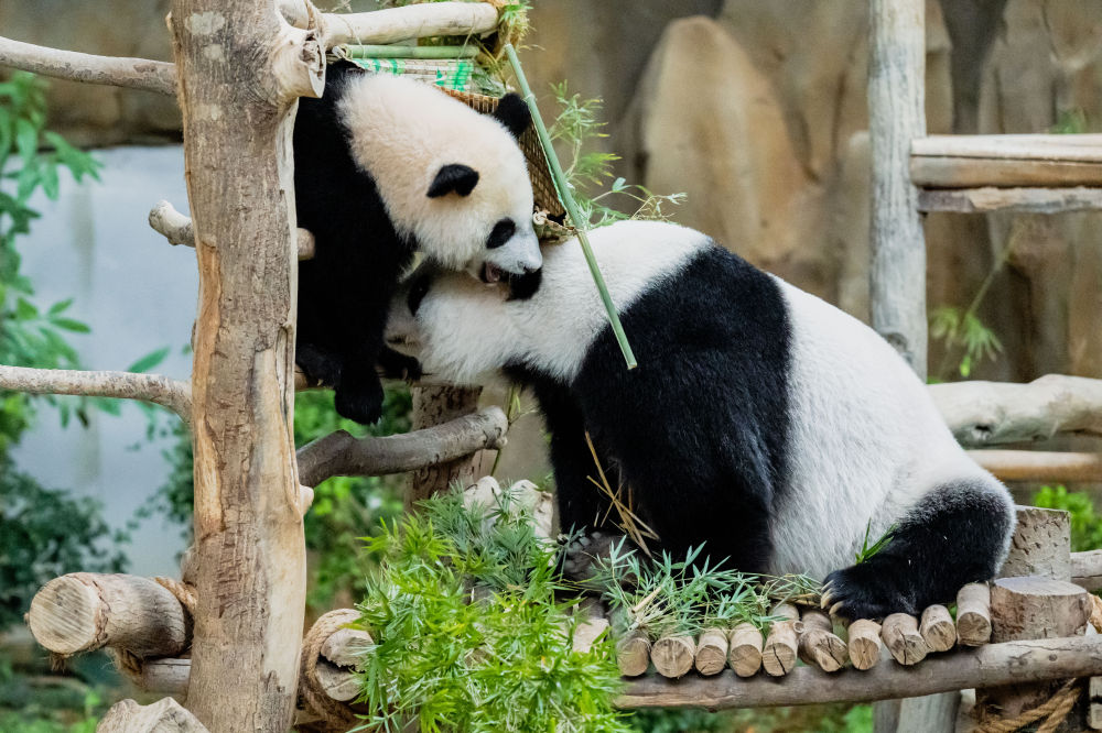 ↑5月25日,大熊猫宝宝“升谊”和妈妈“靓靓”在马来西亚吉隆坡附近的国家动物园玩耍。