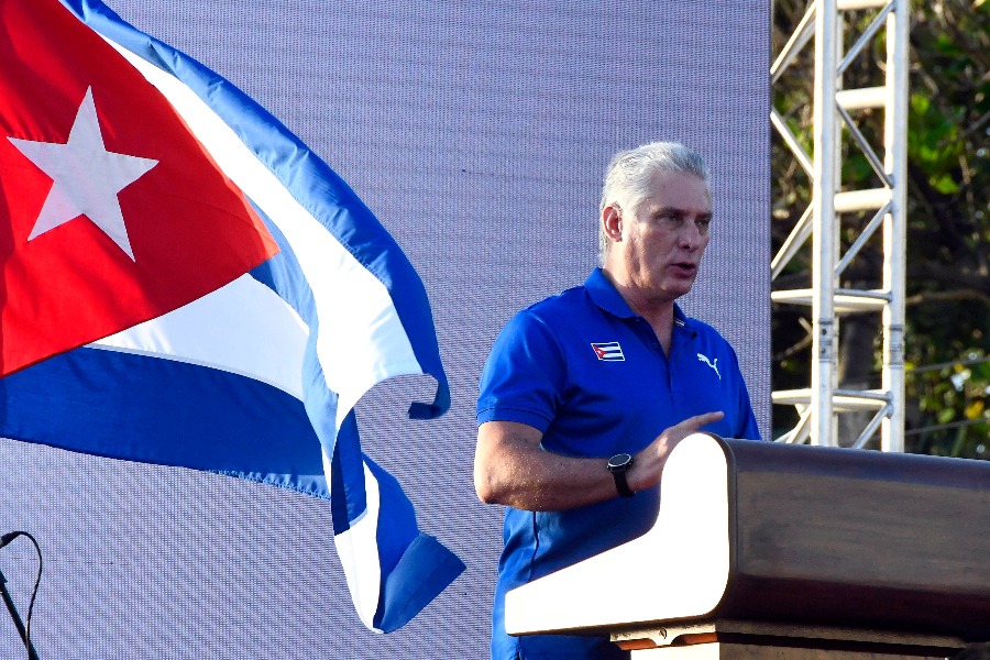 2021年7月17日,古巴国家主席迪亚斯-卡内尔在哈瓦那举行的爱国集会上发表讲话。(新华社发,华金·埃尔南德斯 摄)