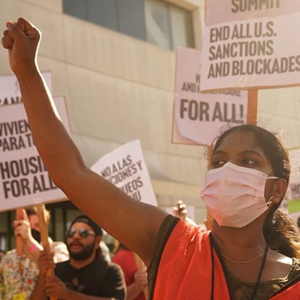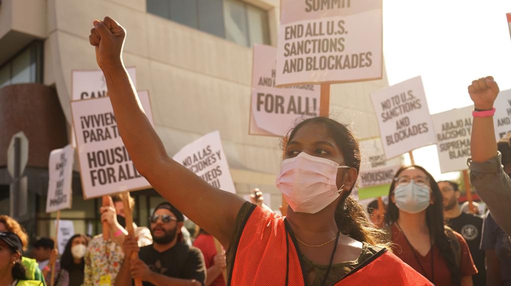 6月10日,在美国加利福尼亚州洛杉矶,一名抗议者手持标语牌参加游行,抗议美国拒绝古巴、尼加拉瓜、委内瑞拉三国领导人参加美洲峰会。(新华社发)